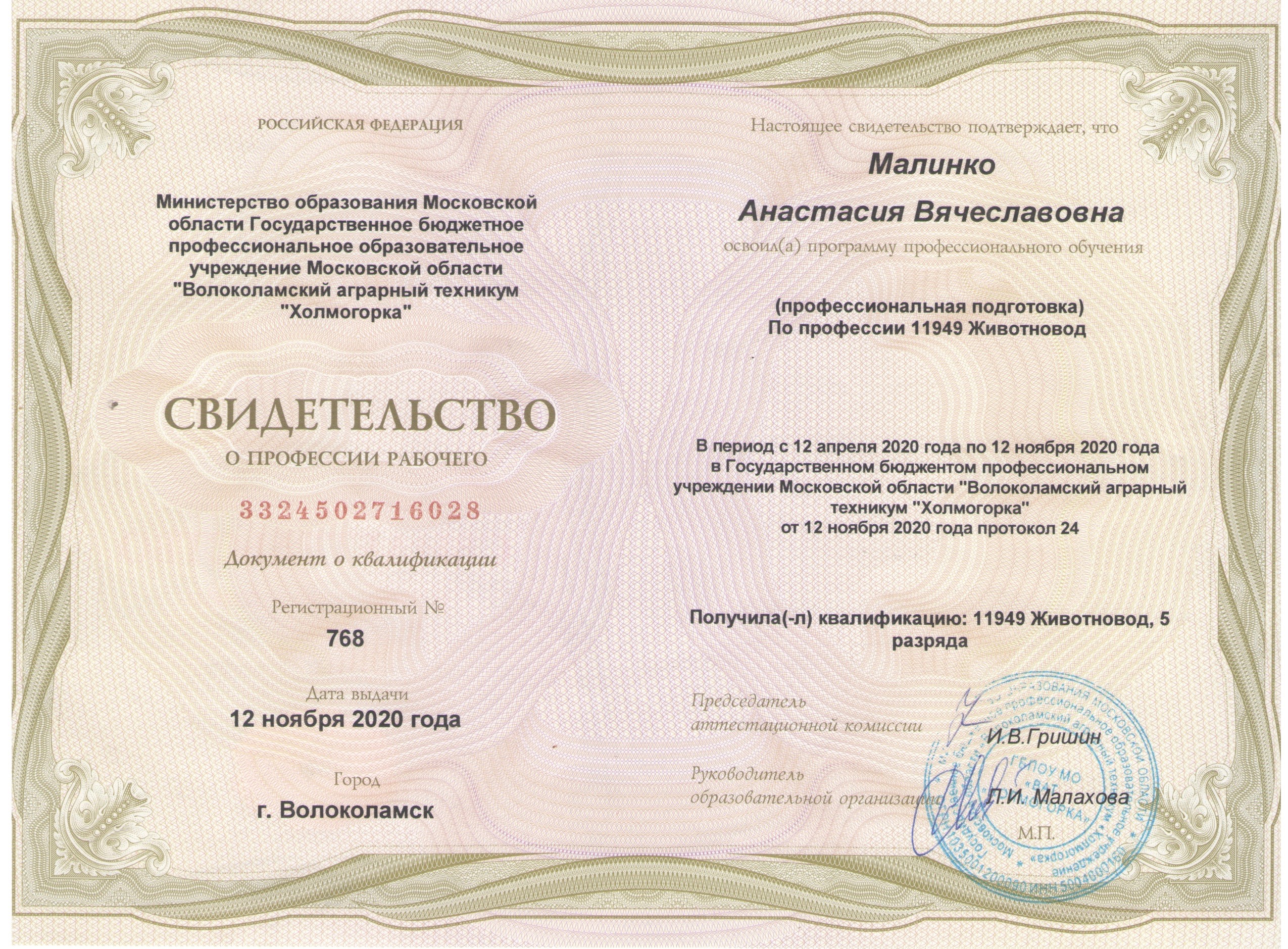 В 2020 году освоила программу профессионального обучения по профессии «животновод».